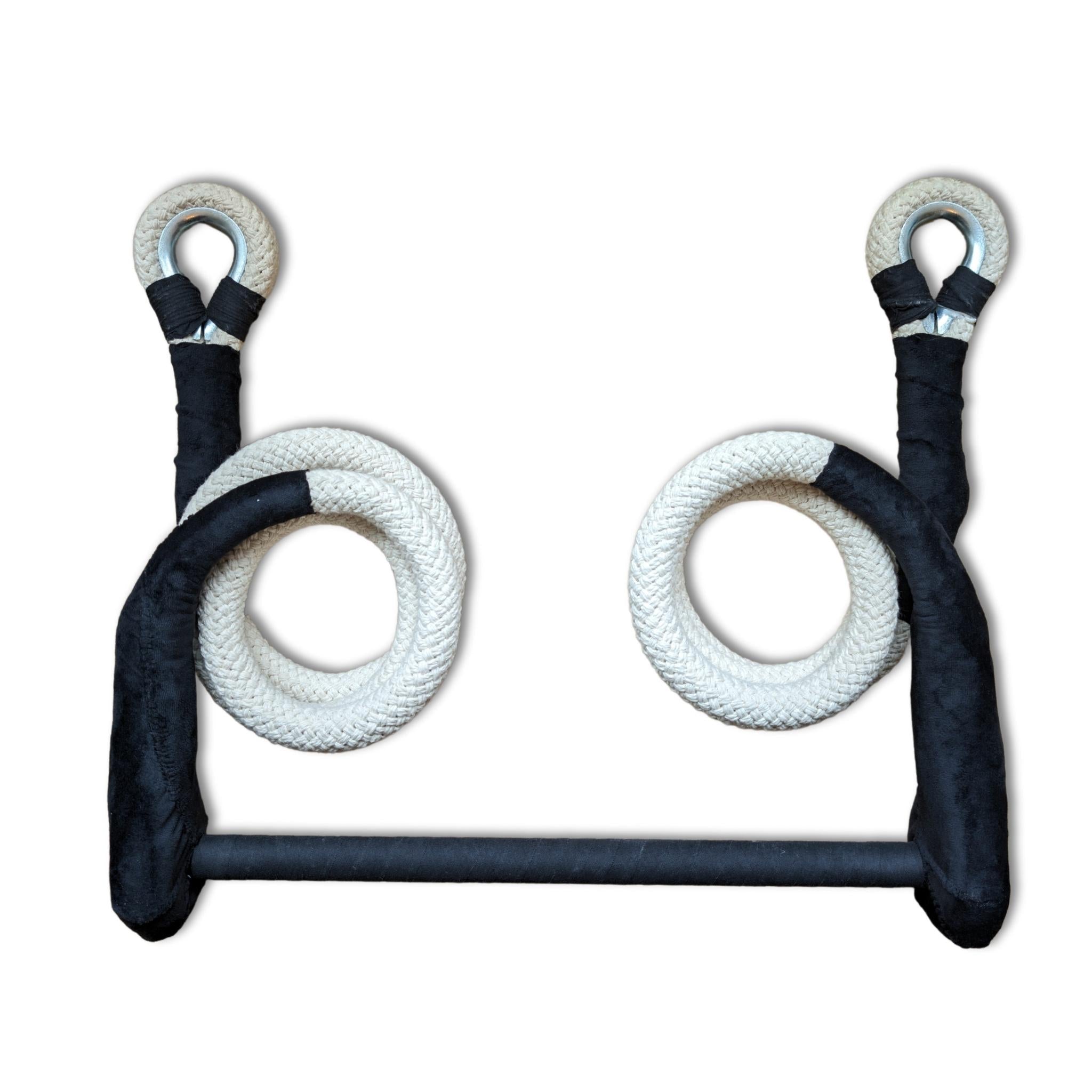 Take your skills to the next level with our aerial dance trapeze! Our trapeze comes in black, red, or white cotton rope, with velvet covered "elbows" for a comfortable and secure grip. The pre-taped black bar ensures a sturdy and safe grip during your performance. With these features, you can focus on your moves and have fun without worrying about slipping or discomfort. Elevate your aerial dance experience today!